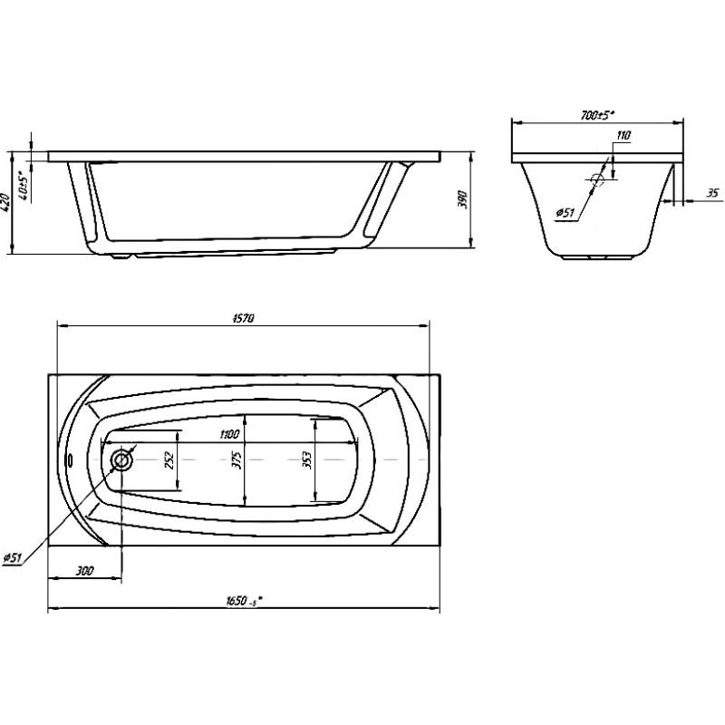 Комфортный размер: 165x70 см - оптимальный размер для комфортного принятия ванны.