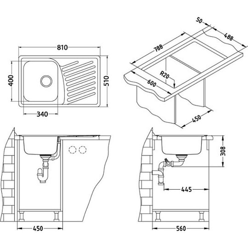 - Готовые отверстия под смеситель:0