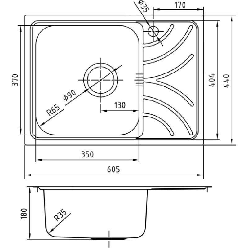 - Намеченные отверстия под смеситель:0