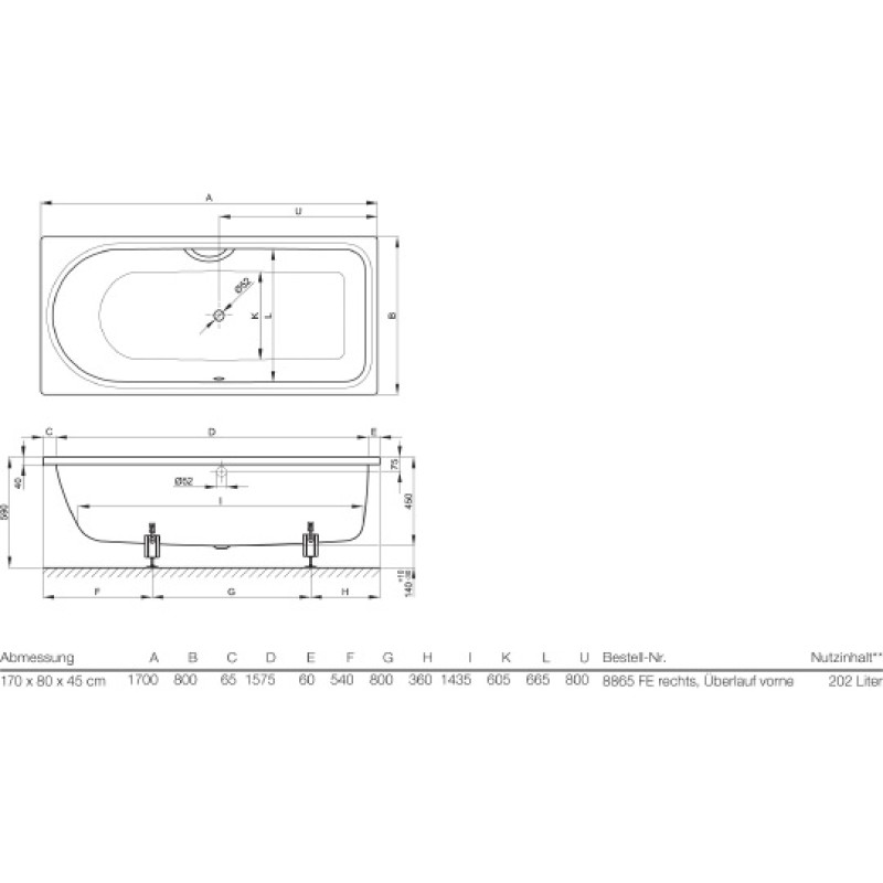 Стальная ванна Bette Ocean 8865 PLUS, AR перелив спереди